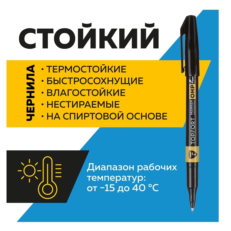 В строительном магазине Сатурн можно купить товар "Маркер для глянцевых поверхностей Topfort OHP черный 0,7 мм" по цене от 72 руб с доставкой за 2 часа по Уфе или оформить самовывоз.
